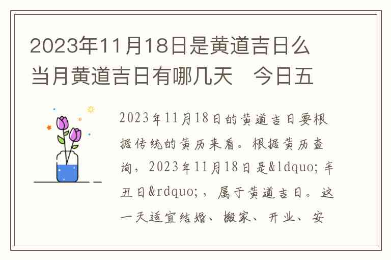 2023年11月18日的黄道吉日要根据传统的黄历来看。根据黄历查询,2023年11月18日是“辛丑日”,属于黄道吉日。这一天适宜结婚、搬家、开业、安床等有喜庆性质的活动,尤其在中国传统文化中,黄道吉日常常被用于挑选结婚日期、搬家日期等重要的生活事件。