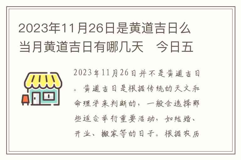 黄道吉日是根据传统的天文和命理学来判断的,一般会选择那些适合举行重要活动,如结婚、开业、搬家等的日子。根据农历的推算,2023年11月26日(农历十月十三)并不在黄道吉日的行列中。这一天并不特别适宜进行一些需要选择良辰吉日的活动。
