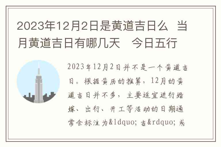 2023年12月2日并不是一个黄道吉日。根据黄历的推算,12月的黄道吉日并不多,主要适宜进行婚嫁、出行、开工等活动的日期通常会标注为“吉”或者“大吉”,而这个日期在黄历上并没有被标为吉日。