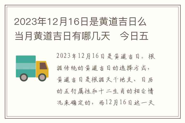 根据传统的黄道吉日的选择方式,黄道吉日是根据天干地支、日历的五行属性和十二生肖的相合情况来确定的,而12月16日这一天在2023年中属“丁亥”日,天干丁为火,地支亥为水,火水相克,但此日并无明显与大部分生肖冲突,符合吉日的标准,因此可以视为黄道吉日,适合进行结婚、搬家、开业等活动。
