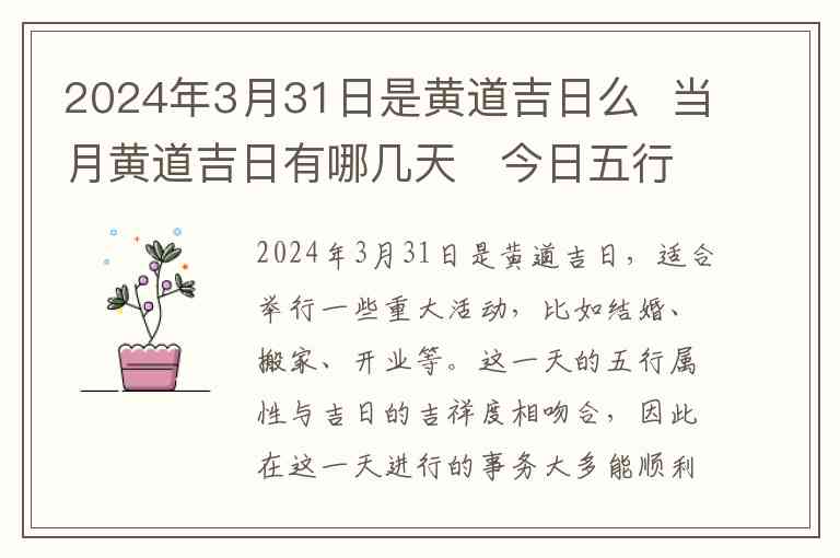 2024年3月31日是黄道吉日,适合举行一些重大活动,比如结婚、搬家、开业等。这一天的五行属性与吉日的吉祥度相吻合,因此在这一天进行的事务大多能顺利开展。
