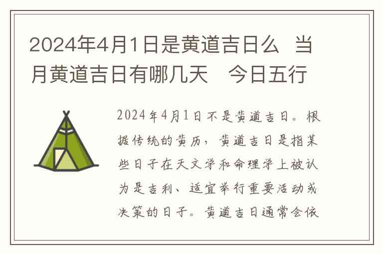 2024年4月1日不是黄道吉日。根据传统的黄历,黄道吉日是指某些日子在天文学和命理学上被认为是吉利、适宜举行重要活动或决策的日子。黄道吉日通常会依据农历的日期以及天干地支的组合来判断,但并非所有的日子都被认为是黄道吉日。