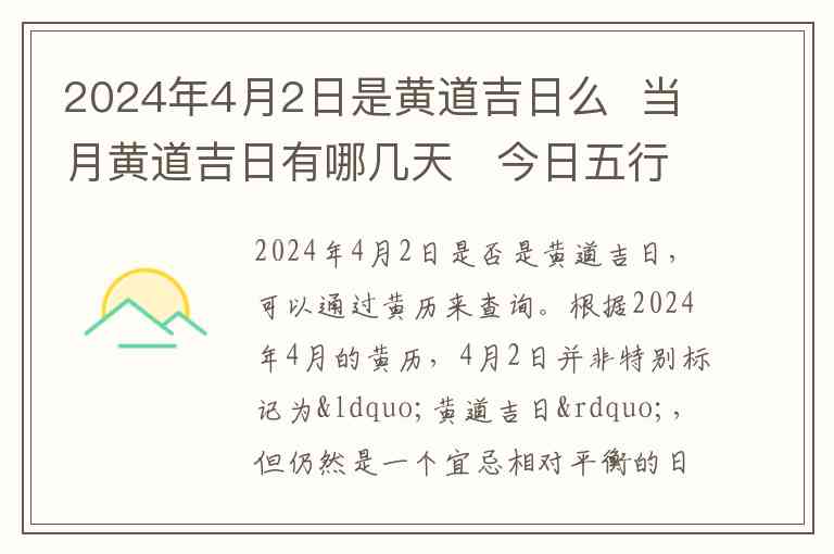 2024年4月2日是否是黄道吉日,可以通过黄历来查询。根据2024年4月的黄历,4月2日并非特别标记为“黄道吉日”,但仍然是一个宜忌相对平衡的日子,可以根据个人需求选择适合的活动。不过,黄道吉日的选择通常基于个人命理、时辰的搭配等因素,因此需要结合个人八字来具体分析。