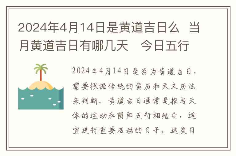 2024年4月14日是否为黄道吉日,需要根据传统的黄历和天文历法来判断。黄道吉日通常是指与天体的运动和阴阳五行相结合,适宜进行重要活动的日子。这类日子的挑选,通常会考虑到日干支、星宿、五行相生相克等因素。