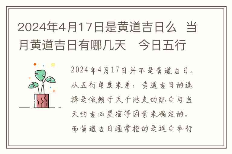 2024年4月17日并不是黄道吉日。从五行角度来看,黄道吉日的选择是依赖于天干地支的配合与当天的吉凶星宿等因素来确定的。而黄道吉日通常指的是适合举行婚礼、开业、搬家等重要活动的吉日,经过农历的推算和天文现象的影响,4月17日这一日并没有特别的吉祥属性。