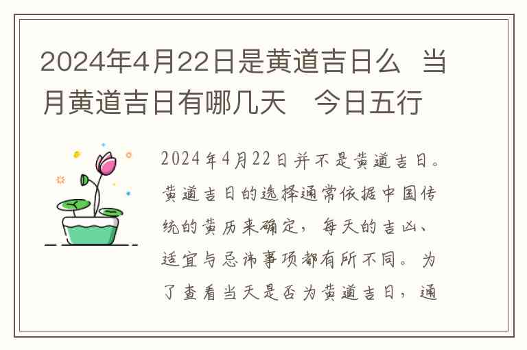 2024年4月22日并不是黄道吉日。黄道吉日的选择通常依据中国传统的黄历来确定,每天的吉凶、适宜与忌讳事项都有所不同。为了查看当天是否为黄道吉日,通常会参考当天的五行、生肖、天干地支等要素。然而,4月22日的黄历显示这一天并不适宜某些活动,比如结婚、搬家等。