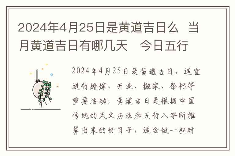 2024年4月25日是黄道吉日,适宜进行婚嫁、开业、搬家、祭祀等重要活动。黄道吉日是根据中国传统的天文历法和五行八字所推算出来的好日子,适合做一些对运势有影响的事,而这一天被视为吉利之日。