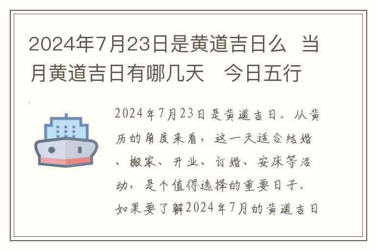 2024年7月23日是黄道吉日。从黄历的角度来看,这一天适合结婚、搬家、开业、订婚、安床等活动,是个值得选择的重要日子。
