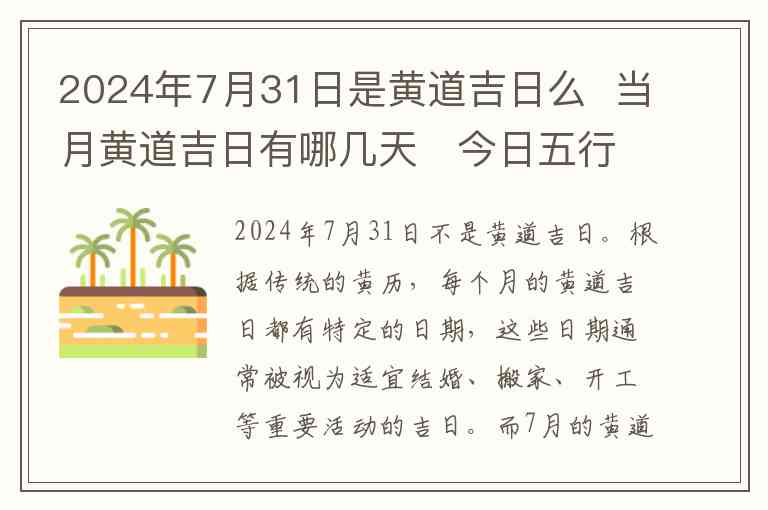 2024年7月31日不是黄道吉日。根据传统的黄历,每个月的黄道吉日都有特定的日期,这些日期通常被视为适宜结婚、搬家、开工等重要活动的吉日。而7月的黄道吉日则通常会在黄历中标注为适合某些特定活动的日期。
