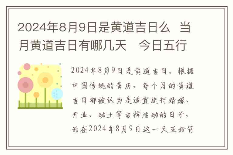 2024年8月9日是黄道吉日。根据中国传统的黄历,每个月的黄道吉日都被认为是适宜进行婚嫁、开业、动土等吉祥活动的日子,而在2024年8月9日这一天正好符合黄道吉日的标准。因此,这一天适合进行各种有利的活动。