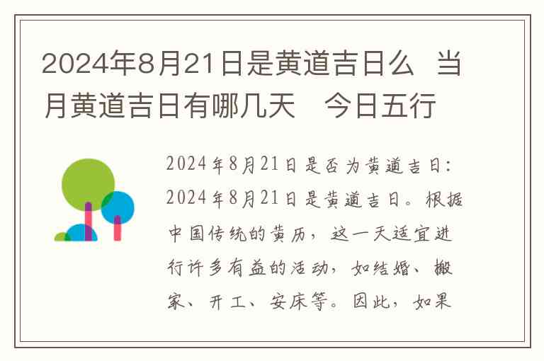 2024年8月21日是黄道吉日。根据中国传统的黄历,这一天适宜进行许多有益的活动,如结婚、搬家、开工、安床等。因此,如果你有重要的事务安排,这一天是一个不错的选择。