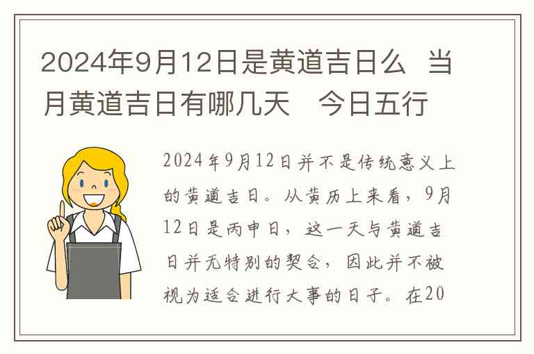 2024年9月12日并不是传统意义上的黄道吉日。从黄历上来看,9月12日是丙申日,这一天与黄道吉日并无特别的契合,因此并不被视为适合进行大事的日子。
