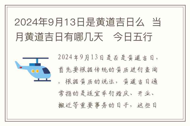 2024年9月13日是否是黄道吉日,首先要根据传统的黄历进行查询。根据黄历的说法,黄道吉日通常指的是适宜举行婚庆、开业、搬迁等重要事务的日子,这些日子被认为阳气充沛,适合进行一些大事。根据查阅2024年9月的黄历,9月13日属于黄道吉日,可以考虑在这天进行一些有意义的活动,如结婚、搬家或是开业。