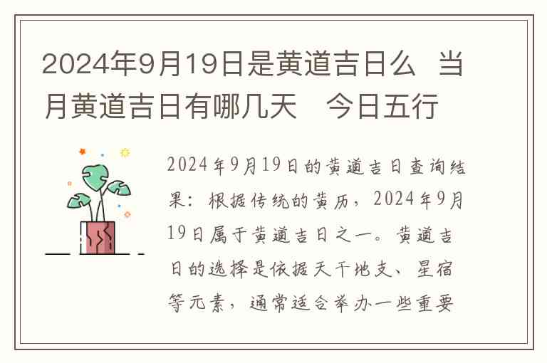 2024年9月19日的黄道吉日查询结果:根据传统的黄历,2024年9月19日属于黄道吉日之一。黄道吉日的选择是依据天干地支、星宿等元素,通常适合举办一些重要的活动,如结婚、开业、安床等。