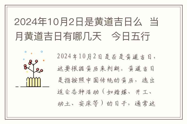 2024年10月2日是否是黄道吉日,这要根据黄历来判断。黄道吉日是指按照中国传统的黄历,选出适合各种活动(如婚嫁、开工、动土、安床等)的日子,通常这些日子会避开冲煞与不宜的天干地支组合。10月2日,具体的黄历信息需要查阅当天的详细内容。然而,根据一般规律,每个月的黄道吉日都会根据天干地支的相合和五行的协调来决定是否吉利,因此我们可以通过查阅详细的黄历来确认。