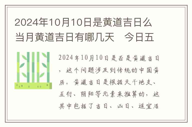 2024年10月10日是否是黄道吉日,这个问题涉及到传统的中国黄历。黄道吉日是根据天干地支、五行、阴阳等元素来推算的,这其中包括了吉日、凶日、适宜活动的时间等内容。根据2024年10月的黄历来看,10月10日是一个适合举行重大事务的吉日,特别是结婚、开业、搬家等事宜都很合适。不过,黄道吉日并不是所有事情都适用,还需要根据个人的八字来做具体判断。