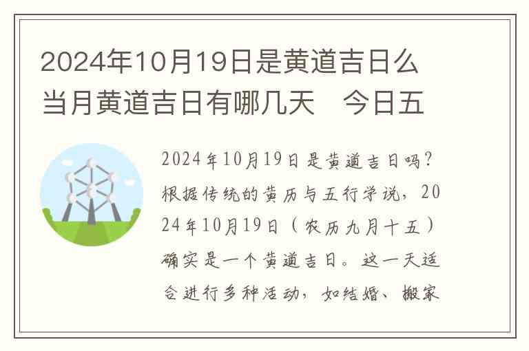 2024年10月19日是黄道吉日吗?根据传统的黄历与五行学说,2024年10月19日(农历九月十五)确实是一个黄道吉日。这一天适合进行多种活动,如结婚、搬家、开业等,特别适合有“吉”字的事情。