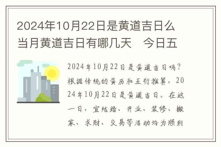 根据传统的黄历和五行推算,2024年10月22日是黄道吉日。在这一日,宜结婚、开业、装修、搬家、求财、交易等活动均为顺利的选择。此日具有良好的吉运,适合进行一些具有重大意义的事务。