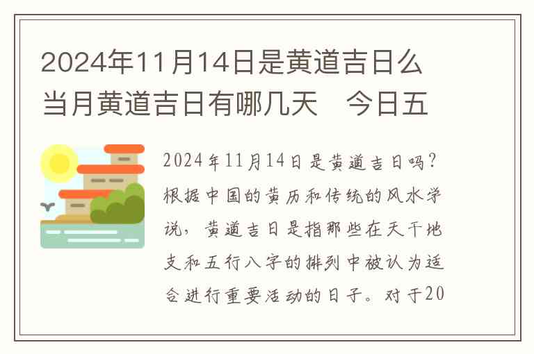 2024年11月14日是黄道吉日吗?根据中国的黄历和传统的风水学说,黄道吉日是指那些在天干地支和五行八字的排列中被认为适合进行重要活动的日子。对于2024年11月14日,它被认为是一个黄道吉日。黄道吉日的特点是适合做婚嫁、开业、搬家、安床、求财等一系列需要吉利日子的活动。
