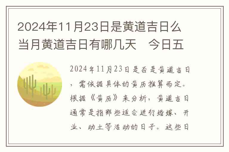 2024年11月23日是否是黄道吉日,需依据具体的黄历推算而定。根据《黄历》来分析,黄道吉日通常是指那些适合进行婚嫁、开业、动土等活动的日子。这些日期通常是根据天文和传统的五行、阴阳学说来选择的。而2024年11月23日,按照黄历来推算,属于平常的一天,并不是特别标注的黄道吉日。因此,可以说这一天并不是典型的黄道吉日。