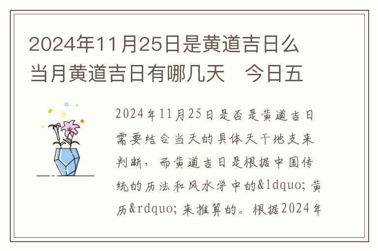 2024年11月25日是否是黄道吉日需要结合当天的具体天干地支来判断,而黄道吉日是根据中国传统的历法和风水学中的“黄历”来推算的。根据2024年11月的黄历,11月25日是阴历的十月十七,天干地支为甲辰日。根据传统的黄历,它并不是一个普遍推荐的“黄道吉日”,也就是说,这一天并不被认为是所有活动都适宜的理想时机。