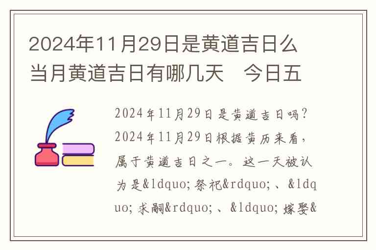 2024年11月29日根据黄历来看,属于黄道吉日之一。这一天被认为是“祭祀”、“求嗣”、“嫁娶”、“安床”等活动的吉利日子。黄道吉日是中国传统文化中根据天干地支、五行八字等来判断适宜进行某些特定活动的日子,通常这类日子适合进行一些重要的事情。