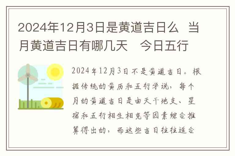 2024年12月3日不是黄道吉日。根据传统的黄历和五行学说,每个月的黄道吉日是由天干地支、星宿和五行相生相克等因素综合推算得出的,而这些吉日往往适合结婚、搬家、开业等重要活动。根据农历的安排,2024年12月的黄道吉日为:12月6日、12月11日、12月13日、12月18日、12月24日、12月28日等几天。