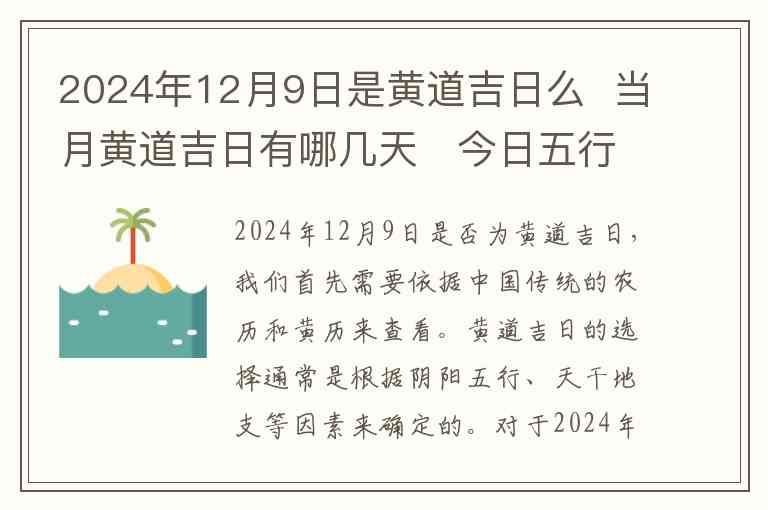 2024年12月9日是否为黄道吉日,我们首先需要依据中国传统的农历和黄历来查看。黄道吉日的选择通常是根据阴阳五行、天干地支等因素来确定的。对于2024年12月9日,根据黄历,这一天并非黄道吉日。它可能会被认为是某些特定活动不宜进行的日子,属于"不宜"或"破日"之类的分类。
