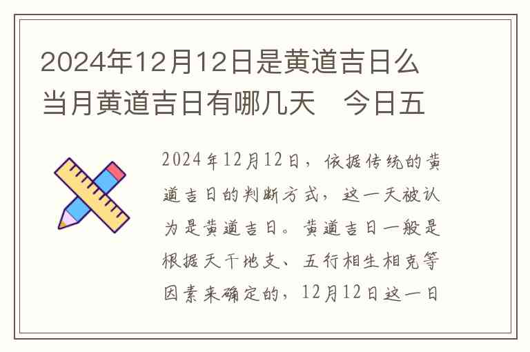 2024年12月12日,依据传统的黄道吉日的判断方式,这一天被认为是黄道吉日。黄道吉日一般是根据天干地支、五行相生相克等因素来确定的,12月12日这一日期在2024年属于天干地支相合,且根据阴阳五行的推算,这一天适宜举行婚礼、开业、搬家等重要活动。