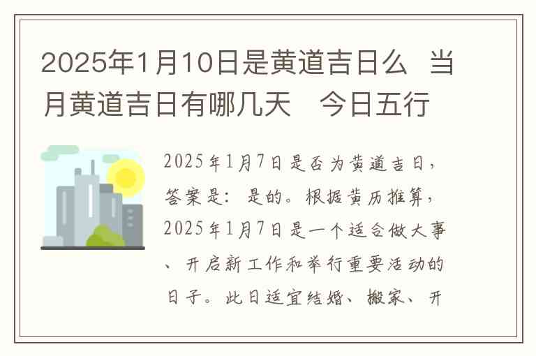 2025年1月10日是否为黄道吉日,答案是:不是。1月10日不是黄道吉日,今天不适合进行一些较为重大的活动或者决策。今天的五行穿衣指南建议选择红色、紫色或者粉色的衣物,这样的颜色能够激活火的能量,带来更多的活力和好运,改善心情,避免陷入不利的局面。
