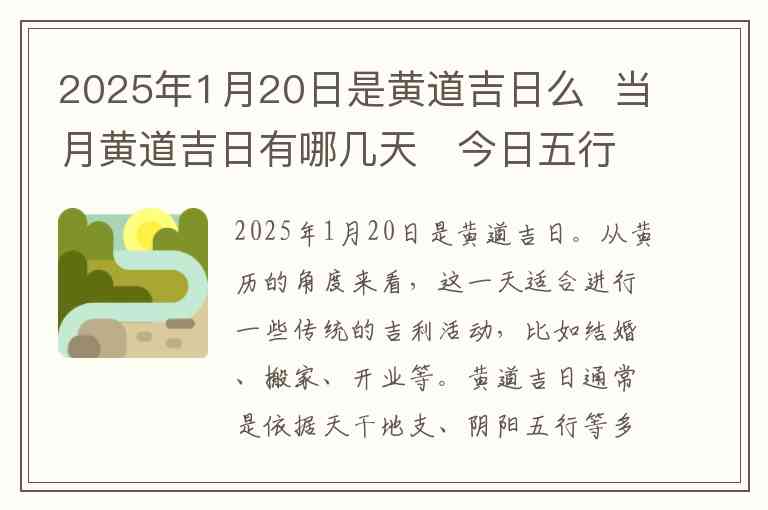 2025年1月20日是黄道吉日。从黄历的角度来看,这一天适合进行一些传统的吉利活动,比如结婚、搬家、开业等。黄道吉日通常是依据天干地支、阴阳五行等多种因素综合评定出来的,目的是选择一个吉祥、顺利的日子来办事。