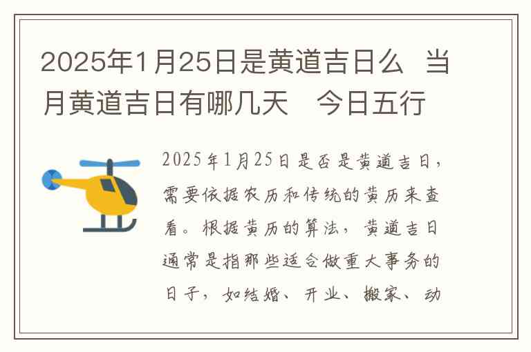 2025年1月25日是否是黄道吉日,需要依据农历和传统的黄历来查看。根据黄历的算法,黄道吉日通常是指那些适合做重大事务的日子,如结婚、开业、搬家、动土等。从具体的日期来看,2025年1月25日属于农历腊月初六,这一天一般被认为是黄道吉日。具体的黄道吉日要参考详细的黄历内容,不过在农历腊月中,常常会有几天是适合进行这些活动的。