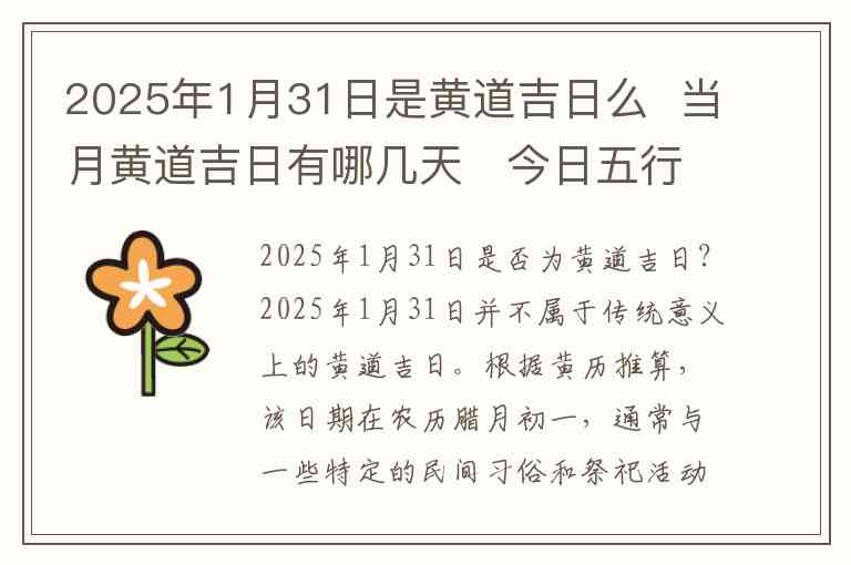 2025年1月31日并不属于传统意义上的黄道吉日。根据黄历推算,该日期在农历腊月初一,通常与一些特定的民间习俗和祭祀活动相联系,但并非黄道吉日之一。黄道吉日一般是指对婚姻、出行、开业、安葬等有利的日子,这些日子多由天干地支的搭配、五行以及星宿等综合因素决定,而不是所有的日子都适合进行这些活动。