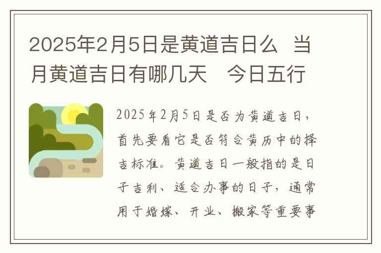 2025年2月5日是否为黄道吉日,首先要看它是否符合黄历中的择吉标准。黄道吉日一般指的是日子吉利、适合办事的日子,通常用于婚嫁、开业、搬家等重要事项的安排。从黄历的角度来看,黄道吉日的选择不仅要看天干地支的组合,还要考虑五行、生肖和每日的冲煞情况。2025年2月5日,即农历正月初六,结合其天干地支的排列,这一天是黄道吉日,非常适合进行一些重要活动。