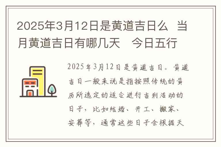 2025年3月12日是黄道吉日。黄道吉日一般来说是指按照传统的黄历所选定的适合进行吉利活动的日子,比如结婚、开工、搬家、安葬等,通常这些日子会根据天干地支、五行、星宿等因素来确定。而2025年3月12日恰好符合这些条件,所以被认定为黄道吉日。