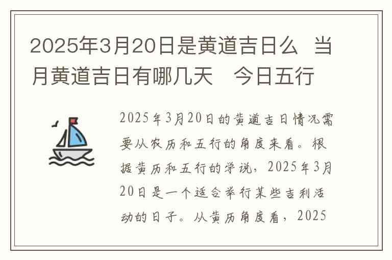 2025年3月20日的黄道吉日情况需要从农历和五行的角度来看。根据黄历和五行的学说,2025年3月20日是一个适合举行某些吉利活动的日子。从黄历角度看,2025年3月20日是黄道吉日。这一天适合结婚、搬家、开业等事务,因此是一个可以考虑进行重要活动的日子。
