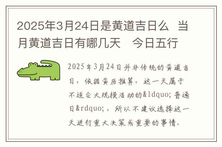 2025年3月24日并非传统的黄道吉日,依据黄历推算,这一天属于不适合大规模活动的“普通日”,所以不建议选择这一天进行重大决策或重要的事情。