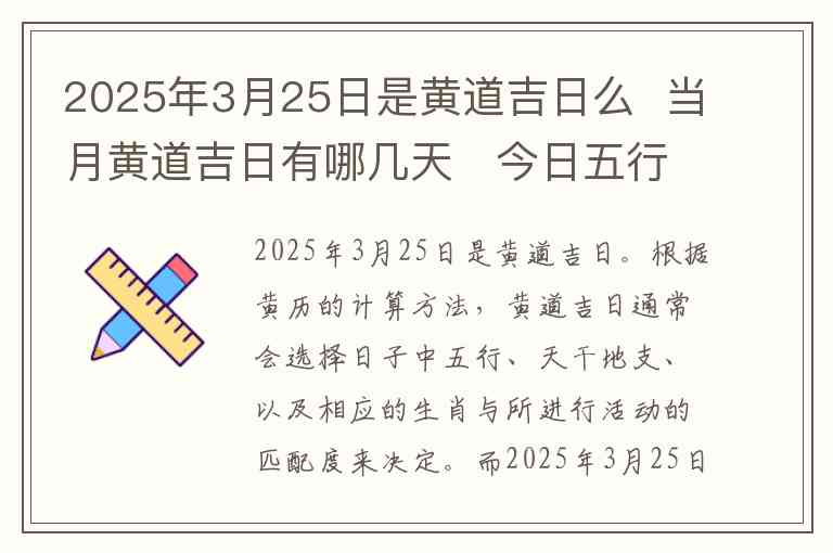 2025年3月25日是黄道吉日。根据黄历的计算方法,黄道吉日通常会选择日子中五行、天干地支、以及相应的生肖与所进行活动的匹配度来决定。而2025年3月25日这一天的天干地支组合以及与生肖的关系,符合传统的黄道吉日要求,因此被认定为是吉利的一天,适合举行婚礼、开业、搬家、安床等有重大意义的活动。