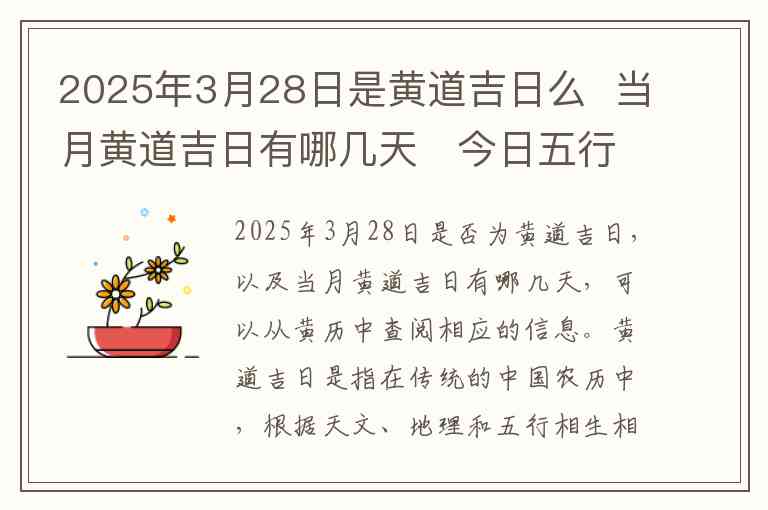 2025年3月28日是否为黄道吉日,以及当月黄道吉日有哪几天,可以从黄历中查阅相应的信息。黄道吉日是指在传统的中国农历中,根据天文、地理和五行相生相克等因素,适宜进行某些特定活动的日子,比如结婚、开业、搬家等。