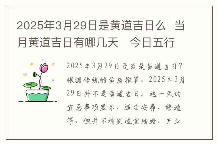 根据传统的黄历推算,2025年3月29日并不是黄道吉日。这一天的宜忌事项显示,适合安葬、修造等,但并不特别适宜结婚、开业等重大活动。所以,若考虑婚礼、开张等重要事务,最好还是避开这一天。
