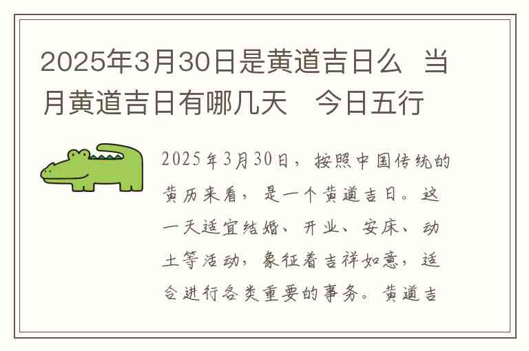 2025年3月30日,按照中国传统的黄历来看,是一个黄道吉日。这一天适宜结婚、开业、安床、动土等活动,象征着吉祥如意,适合进行各类重要的事务。黄道吉日是依据天干地支与阴阳五行的配合情况来推算的,通常在古代黄历中标明的吉日与不吉日(凶日)都有严格的理论依据。