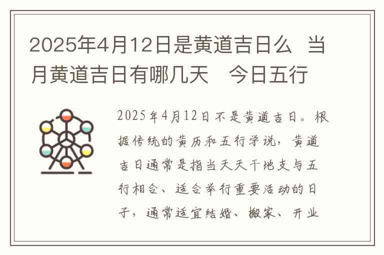 2025年4月12日不是黄道吉日。根据传统的黄历和五行学说,黄道吉日通常是指当天天干地支与五行相合、适合举行重要活动的日子,通常适宜结婚、搬家、开业等。