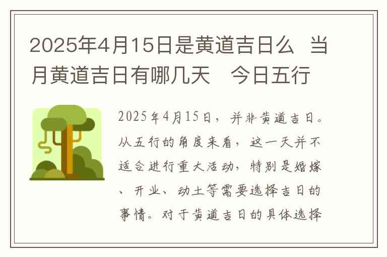 2025年4月15日,并非黄道吉日。从五行的角度来看,这一天并不适合进行重大活动,特别是婚嫁、开业、动土等需要选择吉日的事情。对于黄道吉日的具体选择,需要参考农历和天象等多个因素,因此如果你有具体的事项计划,最好请教专业的命理师或查阅更加详细的黄历。