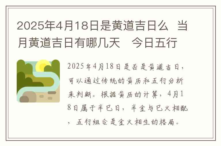 2025年4月18日是否是黄道吉日,可以通过传统的黄历和五行分析来判断。根据黄历的计算,4月18日属于辛巳日,辛金与巳火相配,五行组合是金火相生的格局。按照传统的黄道吉日选择标准,金火相生通常有较好的运势,尤其适合进行与金属、火有关的事务,比如开工、签约、搬家等,因此可以认为4月18日是一个黄道吉日。
