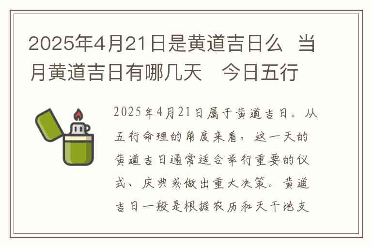 2025年4月21日属于黄道吉日。从五行命理的角度来看,这一天的黄道吉日通常适合举行重要的仪式、庆典或做出重大决策。黄道吉日一般是根据农历和天干地支的搭配来计算的,因此它通常被视为有利的日子,尤其是在婚礼、开业、动工等活动中。