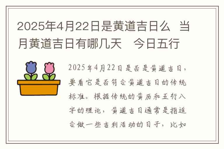 2025年4月22日是否是黄道吉日,要看它是否符合黄道吉日的传统标准。根据传统的黄历和五行八字的理论,黄道吉日通常是指适合做一些吉利活动的日子,比如结婚、开业、搬家等,具有吉祥象征的日子。