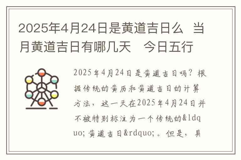 2025年4月24日是黄道吉日吗?根据传统的黄历和黄道吉日的计算方法,这一天在2025年4月24日并不被特别标注为一个传统的“黄道吉日”。但是,具体黄道吉日的选择通常根据不同的历法系统、年份的天文背景以及个人的命理需求来决定。因此,如果你有特定的需求或活动需要选择吉日,最好根据个人的八字命理来进行详细的分析。