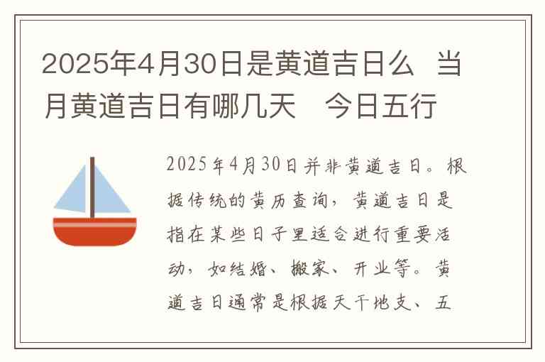 2025年4月30日并非黄道吉日。根据传统的黄历查询,黄道吉日是指在某些日子里适合进行重要活动,如结婚、搬家、开业等。黄道吉日通常是根据天干地支、五行、生肖等因素来确定的,具有一些特定的文化意义。