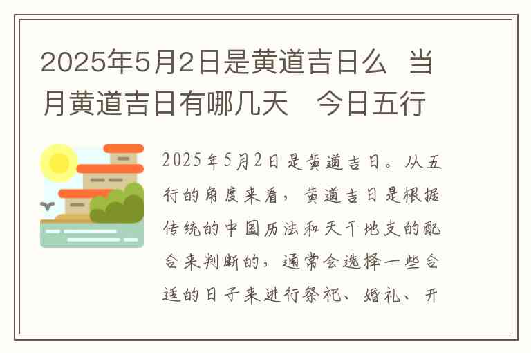 以上就是关于2025年5月2日是否为黄道吉日的解答,以及当月黄道吉日的安排和今日的五行穿衣指南。