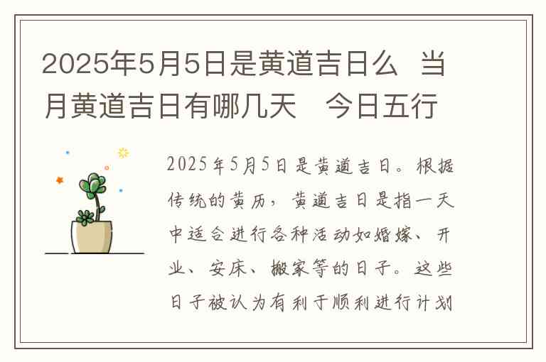 2025年5月5日是黄道吉日。根据传统的黄历,黄道吉日是指一天中适合进行各种活动如婚嫁、开业、安床、搬家等的日子。这些日子被认为有利于顺利进行计划中的事务,且可以带来好运。2025年5月5日这一天,恰逢黄道吉日,因此是一个适合举办喜庆活动或开展新事物的好日子。
